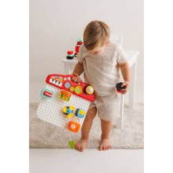 De set bevat: een muur met noppen, blokken met motorische activiteiten, een voertuig met ruimte voor de blokken en een geluidspaneel met een piano, bel, lampje en tandwielen.